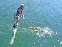 The AquaSkipper is a human powered hydrofoil that gets its thrust from jumping up and down. If you stop jumping you will sink and find yourself swimming back to the dock. Probably the best way to get a feel for how it works is to watch the movie. We made this video on the first outing and it shows early failures as well as later more successful attempts.